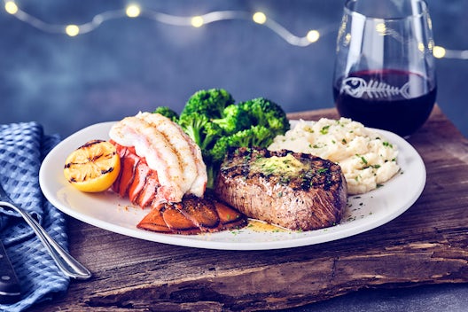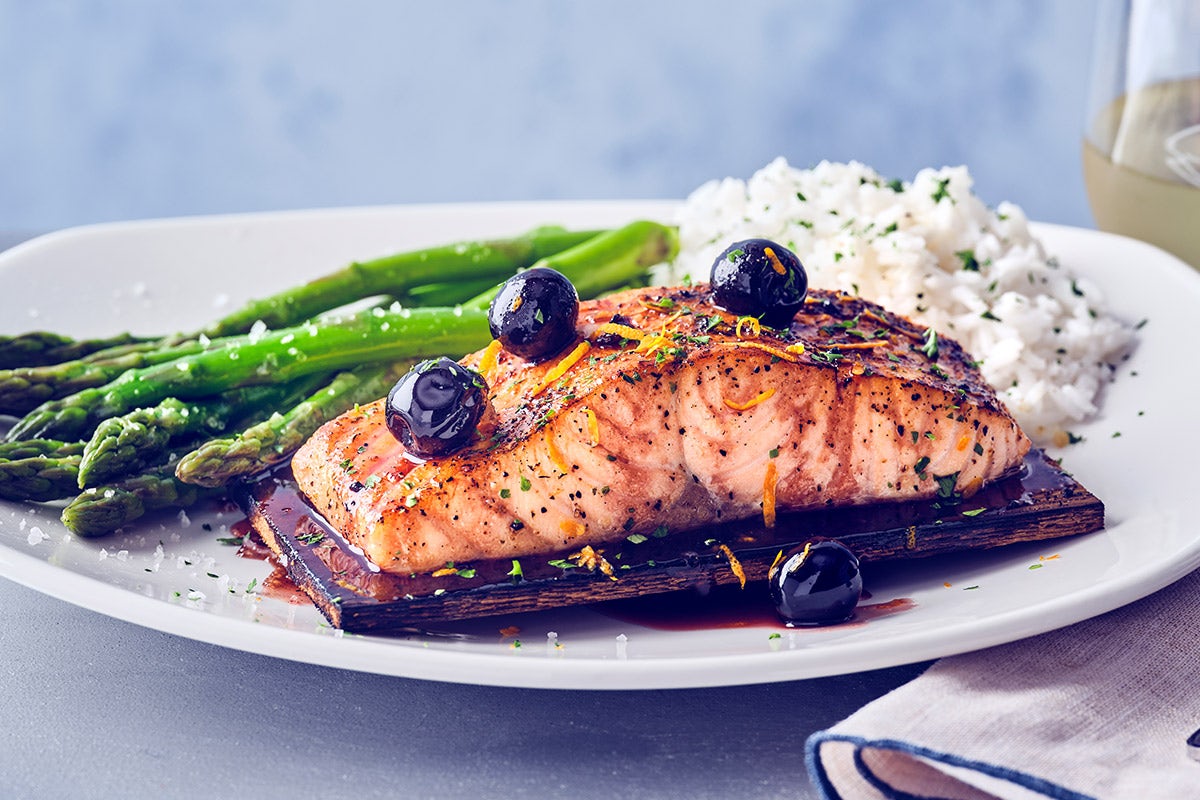 Cedar plank roasted salmon, brushed with a Jim Beam bourbon honey glaze, finished with Bordeaux cherry gastrique and fresh grated orange zest, served with asparagus and jasmine rice