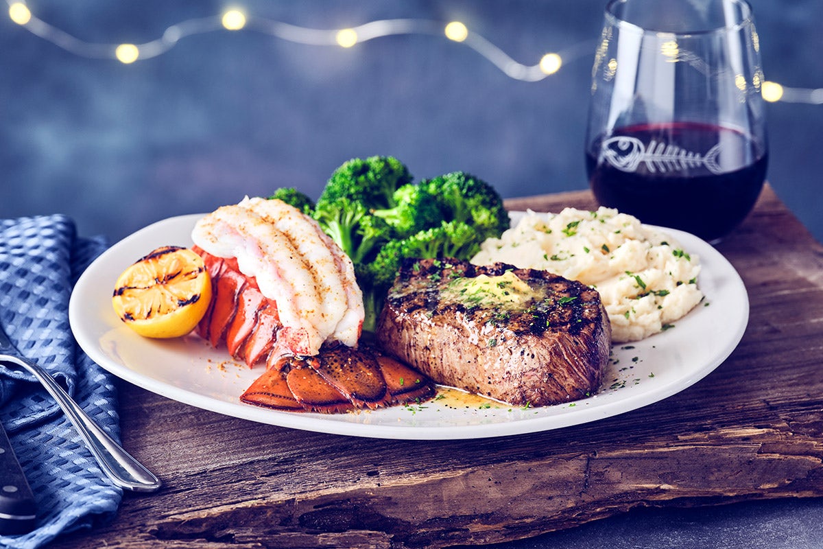 9 oz sirloin topped with chef-crafted Old Bay® butter, paired with a seasoned and steamed cold water lobster tail, served with garlic whipped potatoes and seasonal vegetable